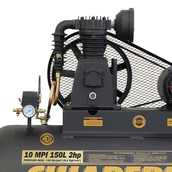 O equipamento trabalha com pressão máxima de 140 PSI (9,4 bar) e possui reservatório de 150 litros, proporcionando boa autonomia de ar e reduzindo a frequência de acionamento do motor durante o uso.